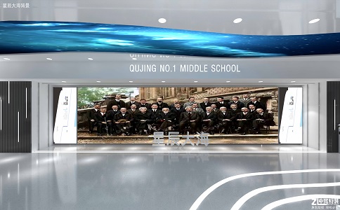 合影墻包含了曲靖一中 “紫薇花”?;盏暮x,藍(lán) 色燈帶如雙手托舉,象征著學(xué)校 和導(dǎo)師對(duì)學(xué)生的呵護(hù)體現(xiàn)出曲靖 一中潤(rùn)澤育人的理念及祝賀學(xué)生 紫薇花盛開(kāi)時(shí)節(jié)取得優(yōu)異成績(jī)的 美好愿景。